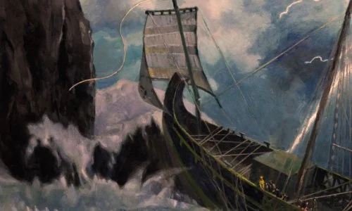 We chose the moment in which the passengers and crew abandon the ship, after wedging it into an inlet and anchoring it from the stern. The main character of the picture is the ocean waves, crashing towards shore. By rights, nobody should have lived through the trip, but Acts records all of them doing so, swimming or else clutching fragments of the ship.